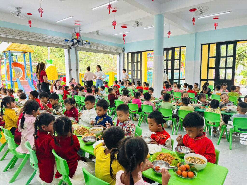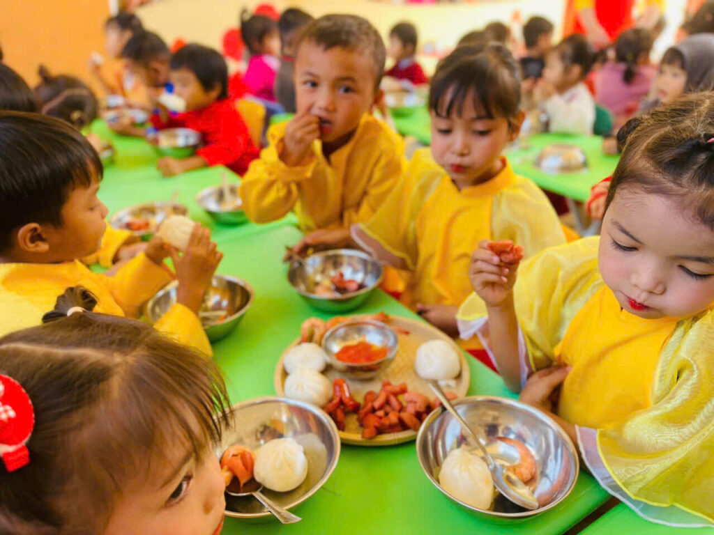 孩子們享用到豐盛的年菜,菜色多樣且兼顧營養。對許多當地孩子而言,這不僅僅是一頓美味的餐食,更是一年中最令人期待的時刻。當孩子們圍坐在一起,共享歡樂時光時,那一雙雙閃耀著喜悅光芒的眼睛與純真的笑容,將溫暖與幸福傳遞給在場的每一個人。除了溫馨的年終餐會外,每位孩子還收到一份新年禮物,包括粽子、一雙新拖鞋和一件漂亮的新衣。這些看似樸實的小禮物,卻承載著滿滿的關懷與愛,為孩子們帶來更加充實與圓滿的新春佳節。